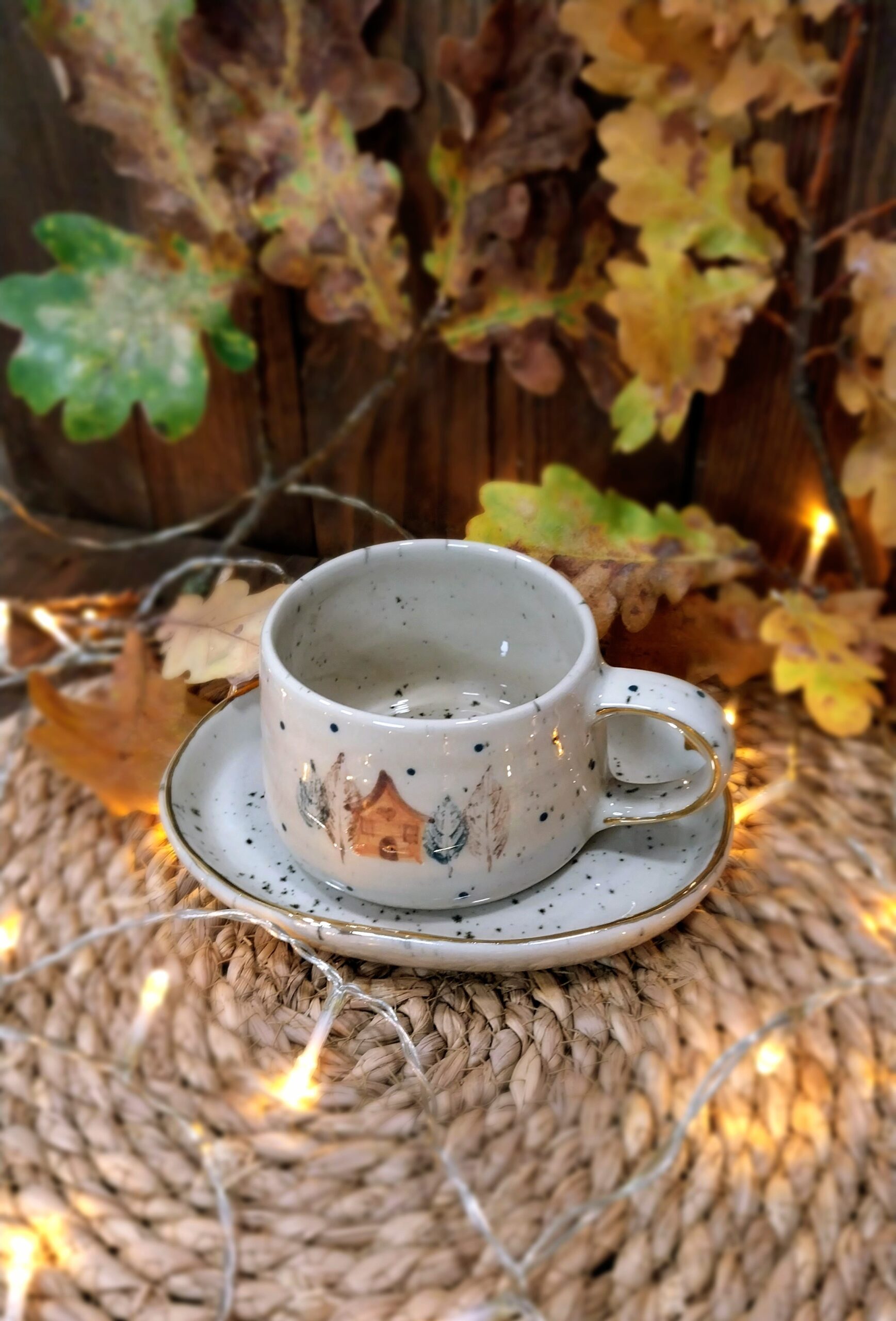 Keramička šalica je u potpunosti ručni rad. Izrađena je od kamenine (stoneware), vrste keramike koju odlikuje visoka izdržljivost i neporoznost. Rukom ukrašena otiskom pravog lista i glazirana transparentnom glazurom. Boja gline (šalice) je svijetlo bež. Ukrašena je nanošenjem pravog zlata. Tanjurić za šalicu se naručuje odvojeno.