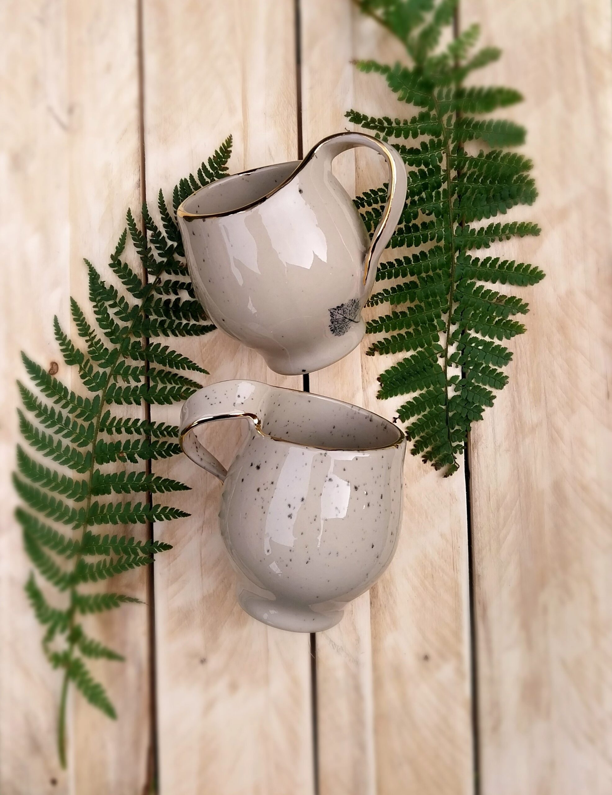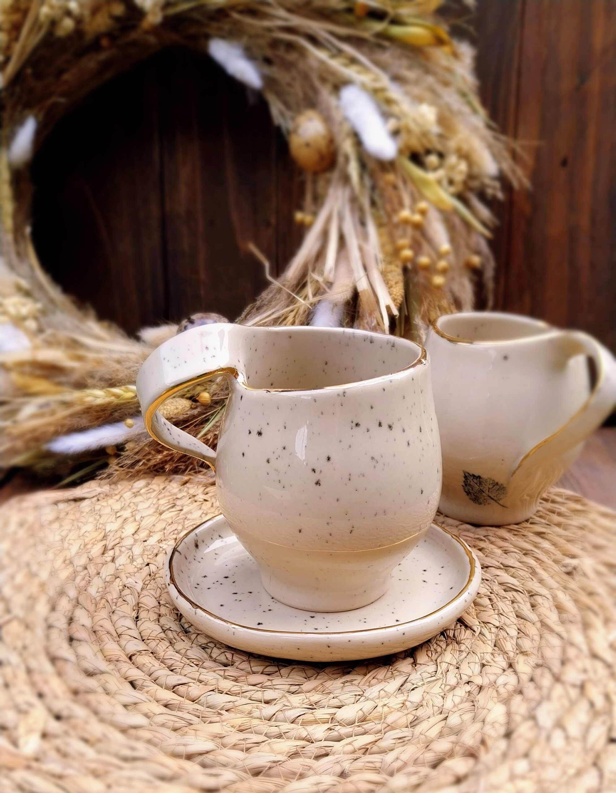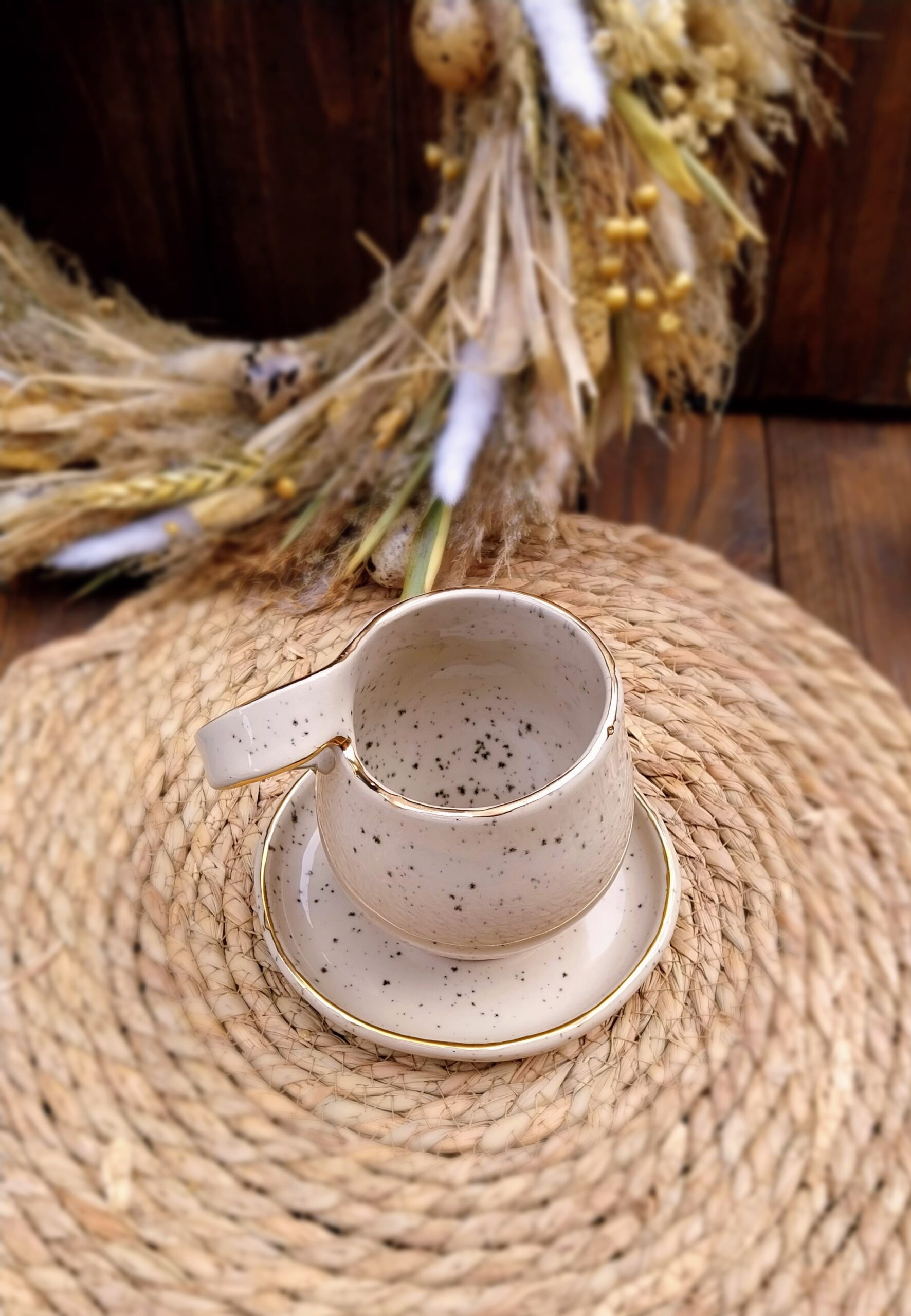 Keramička šalica je u potpunosti ručni rad. Izrađena je od kamenine (stoneware), vrste keramike koju odlikuje visoka izdržljivost i neporoznost. Boja gline (šalice) je svijetlo bež. Ukrašena je nanošenjem pravog zlata. Tanjurić za šalicu se naručuje odvojeno.