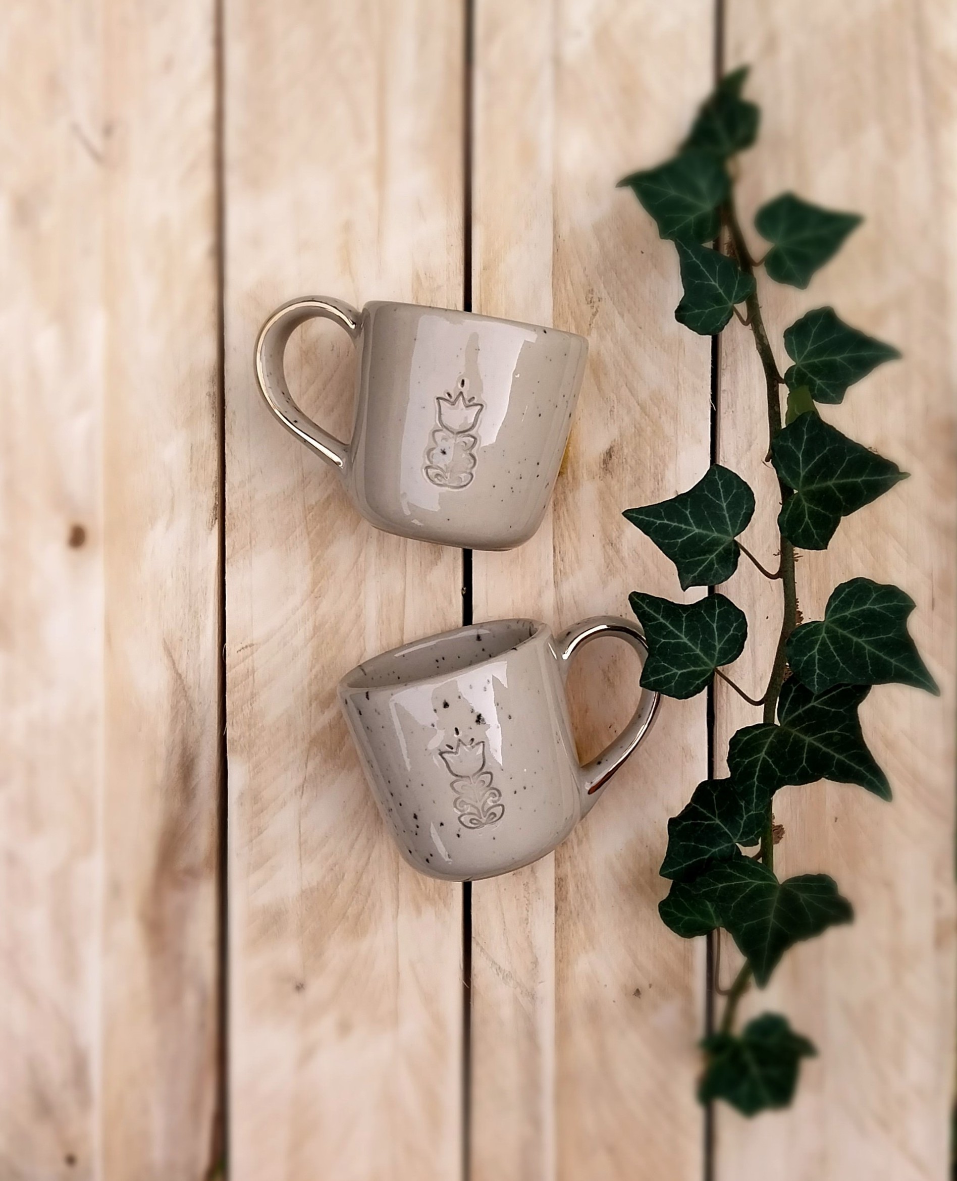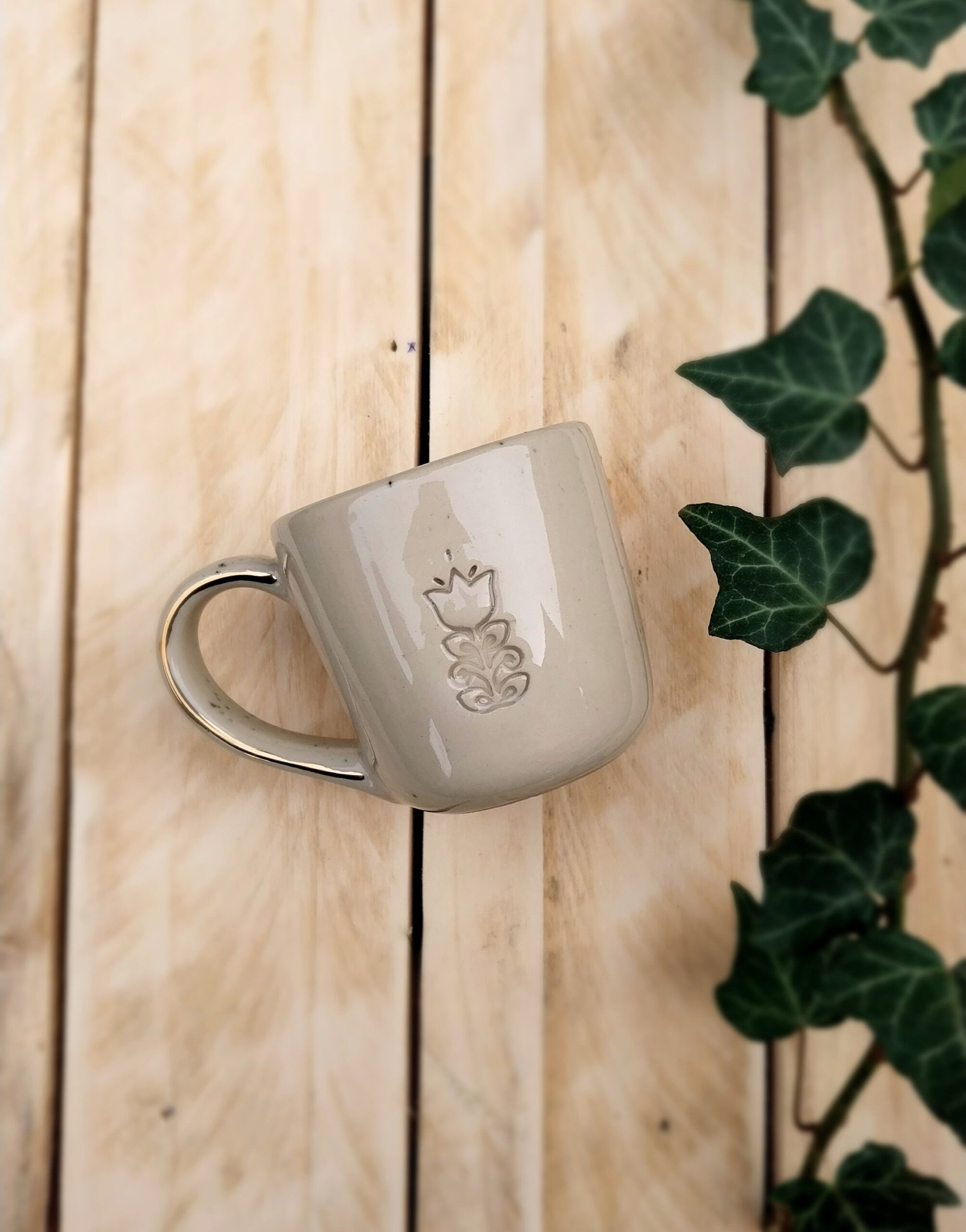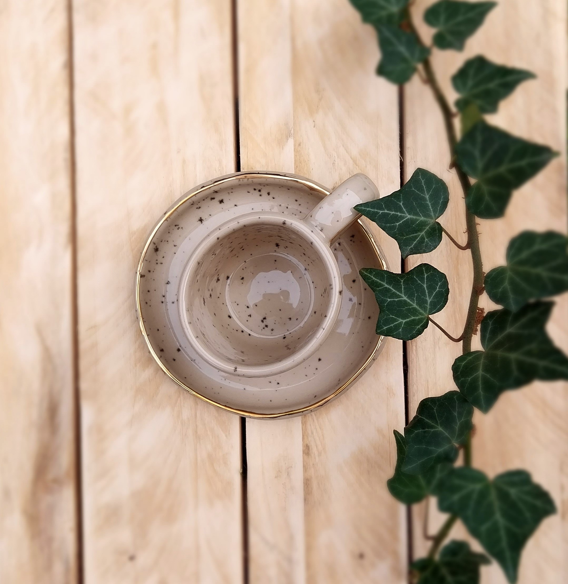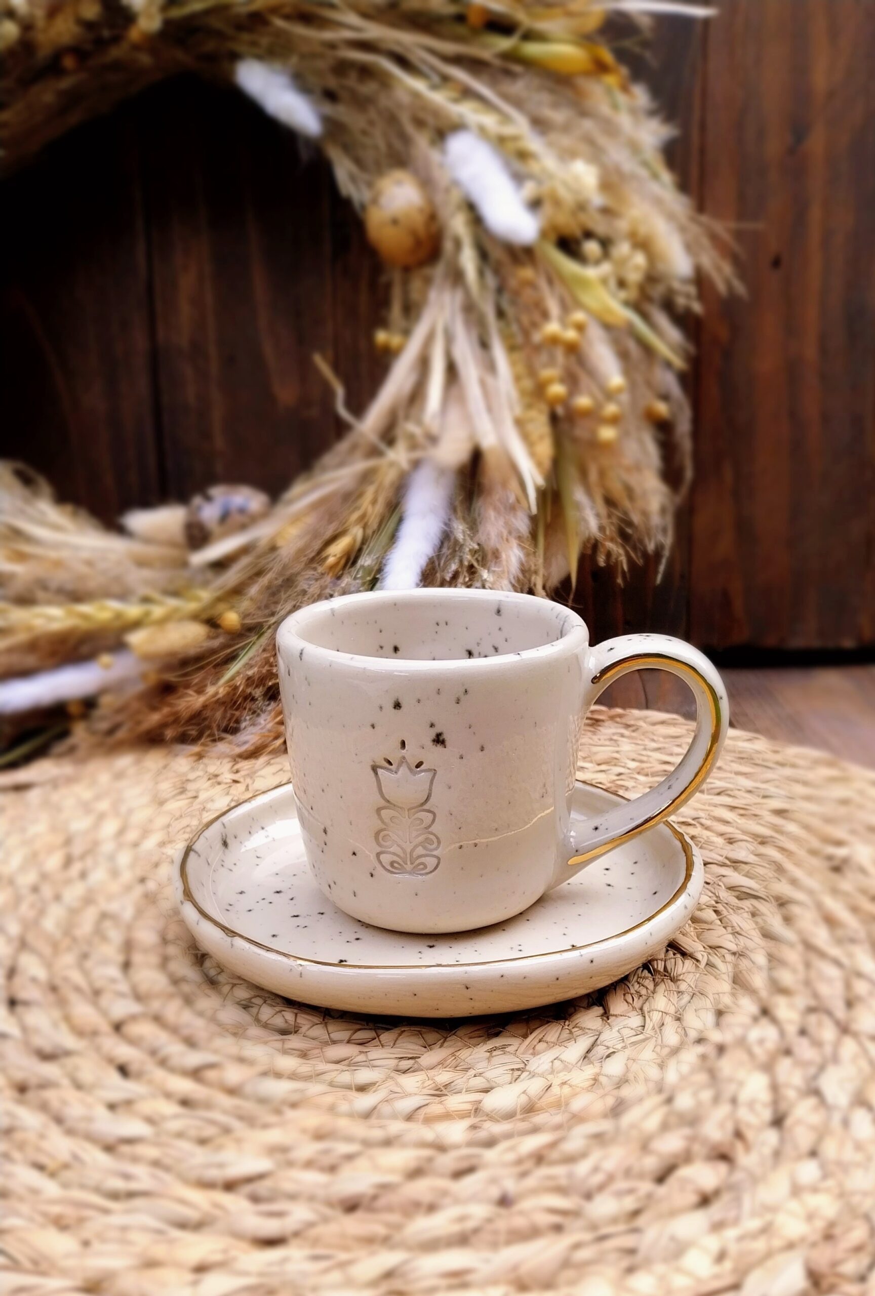 Keramička šalica je u potpunosti ručni rad. Izrađena je od kamenine (stoneware), vrste keramike koju odlikuje visoka izdržljivost i neporoznost. Boja gline (šalice) je svijetlo bež. Ukrašena je nanošenjem pravog zlata. Tanjurić za šalicu se naručuje odvojeno.