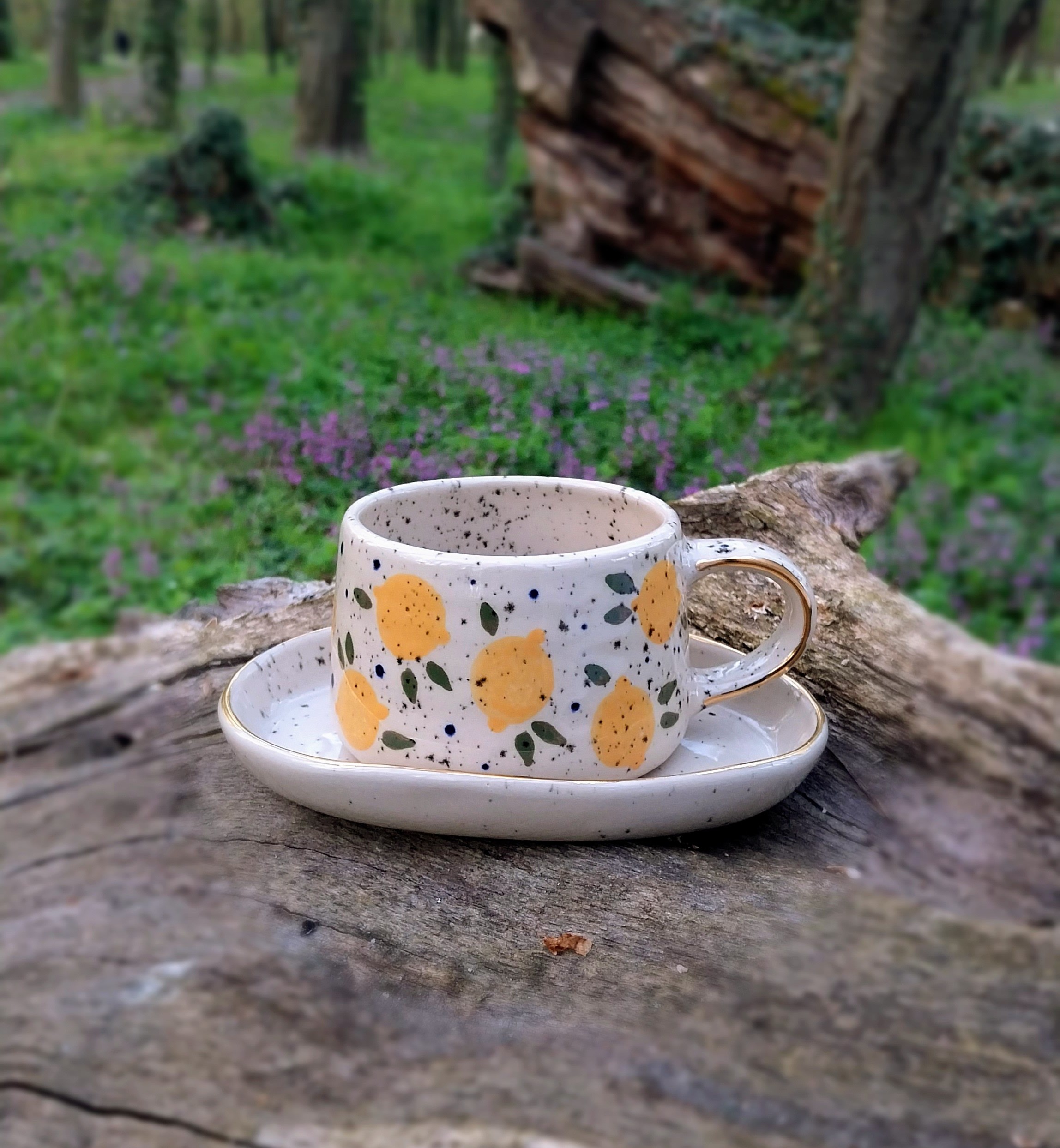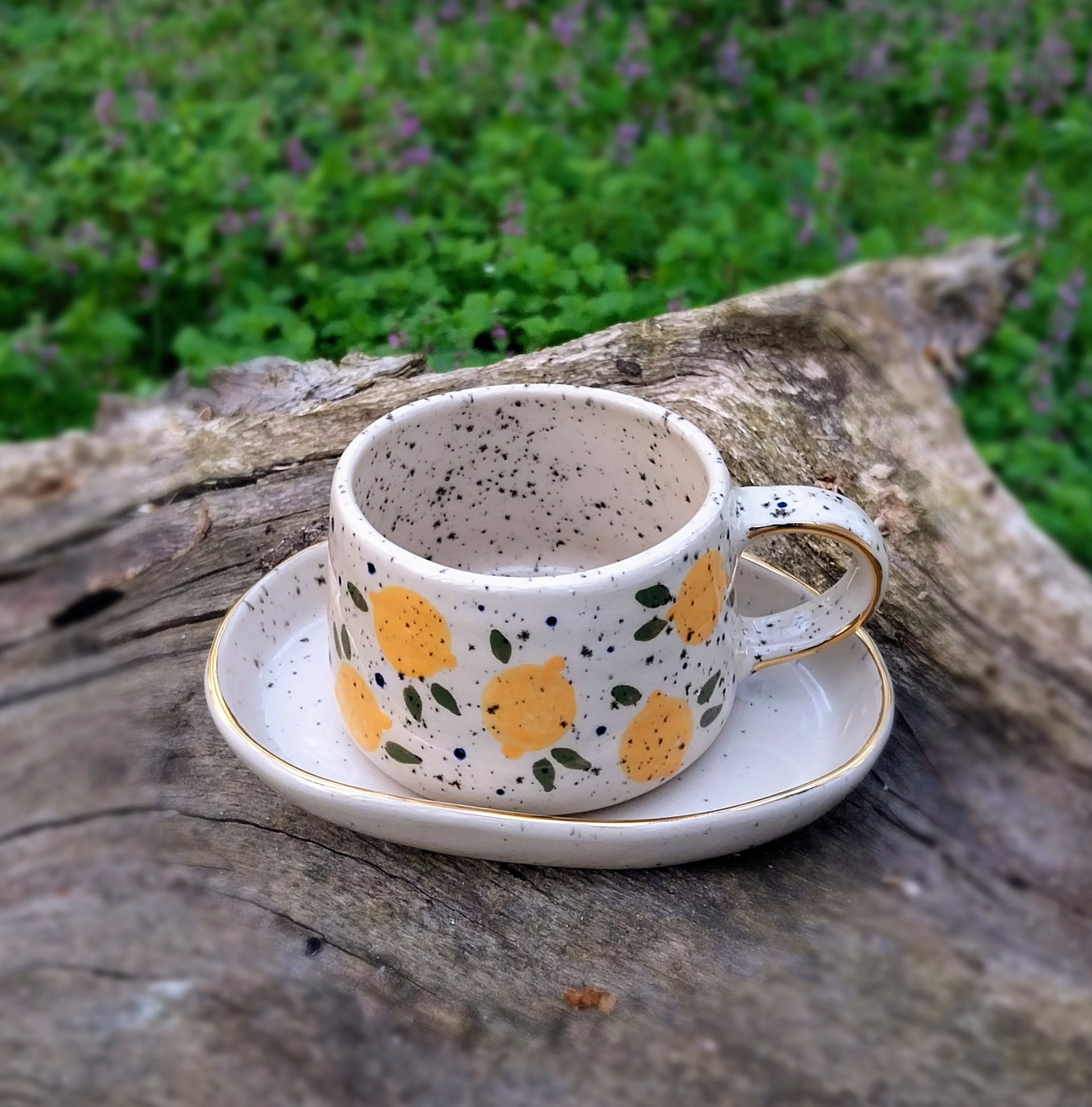 Keramička šalica je u potpunosti ručni rad. Izrađena je od kamenine (stoneware), vrste keramike koju odlikuje visoka izdržljivost i neporoznost. Rukom oslikana podglazurnim bojama i glazirana transparentnom glazurom. Boja gline (šalice) je svijetlo bež.  Ukrašena je nanošenjem pravog zlata. Tanjurić za šalicu se naručuje odvojeno. Za ovaj model šalice odgovara samo tanjurić br. 2.