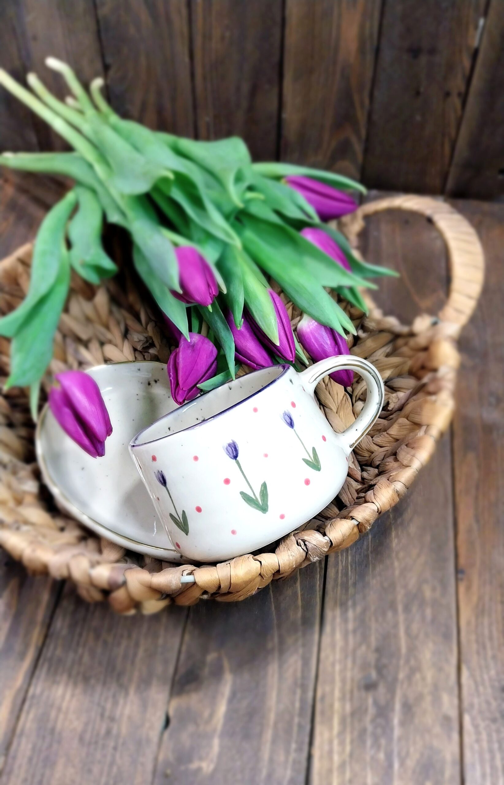 Keramička šalica je u potpunosti ručni rad. Izrađena je od kamenine (stoneware), vrste keramike koju odlikuje visoka izdržljivost i neporoznost. Rukom oslikana podglazurnim bojama i glazirana transparentnom glazurom. Boja gline (šalice) je svijetlo bež. Ukrašena je nanošenjem pravog zlata. Tanjurić za šalicu se naručuje odvojeno. Za ovaj model šalice odgovara samo tanjurić br. 2.