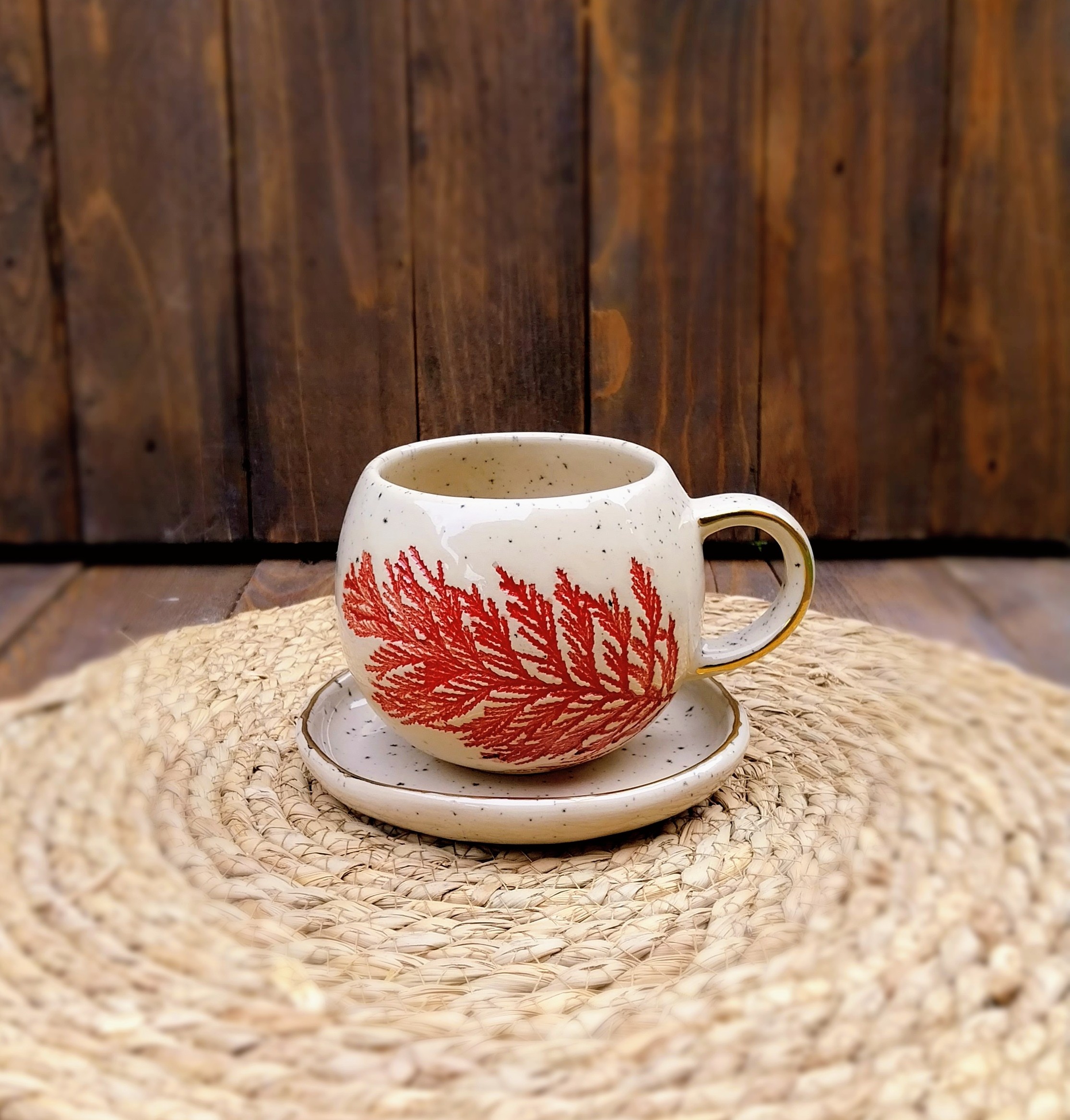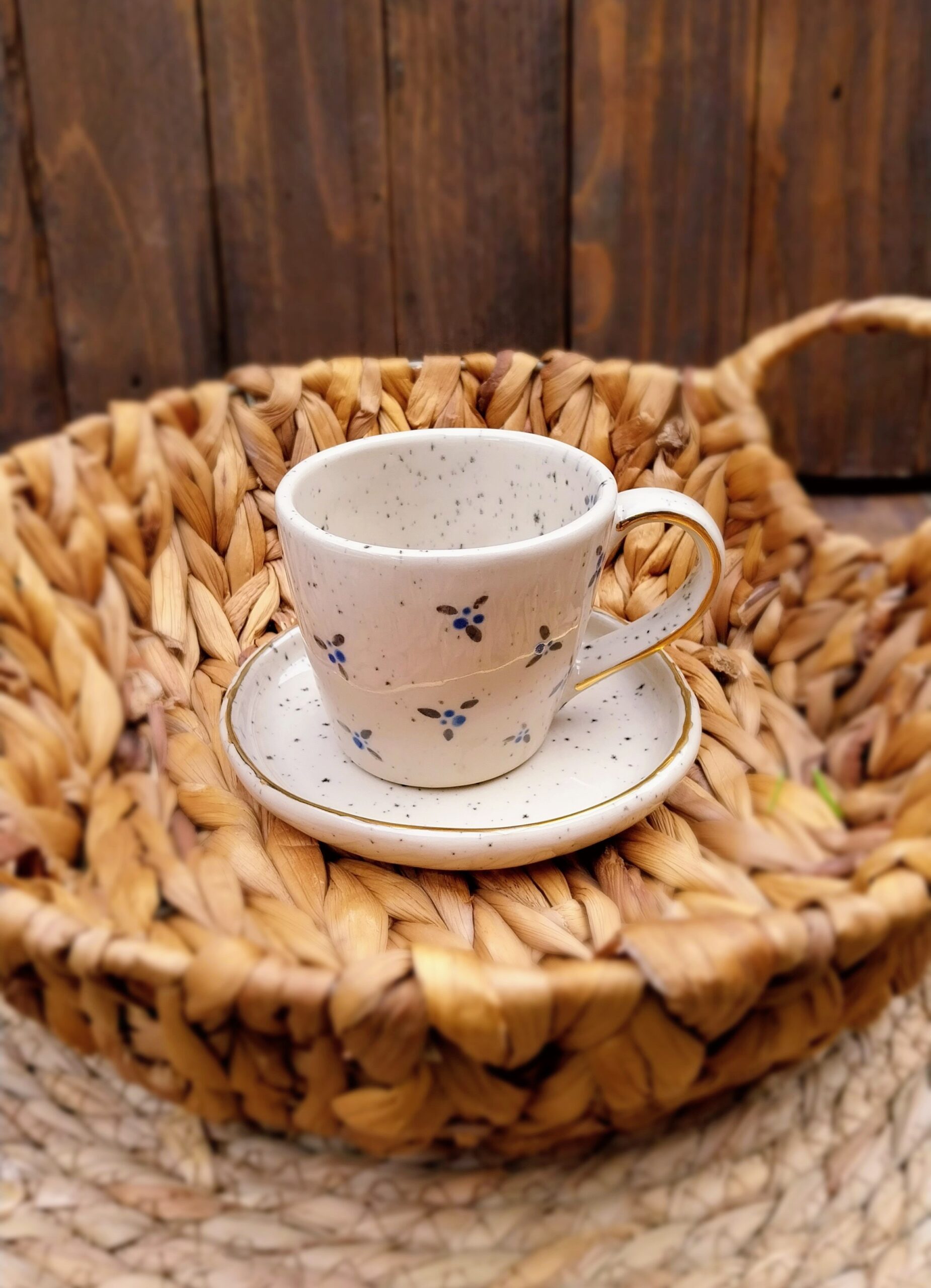 Tanjurić za šalice je u potpunosti ručno izrađen, glaziran transparentnom glazurom. Izrađen je od kamenine (stoneware), vrste keramike koju odlikuje visoka izdržljivost i neporoznost. Boja gline je svijetlo bež. Rubovi tanjurića su ukrašeni pravim zlatom.